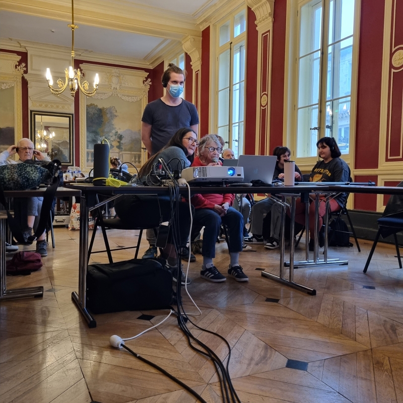 Ensemble, jeunes et séniors écrivent et conçoivent l’audiodescription de plusieurs scènes du spectacle Neige de la compagnie La Part des anges. Ils suivent les étapes d’une création professionnelle : visionnage d’extraits, choix rigoureux des mots pour décrire avec précision le décor, les personnages et leurs actions, puis travail d’interprétation. Les participants s’exercent ensuite à lire leur texte au micro, tandis que les autres le reçoivent au casque, comme en conditions réelles.