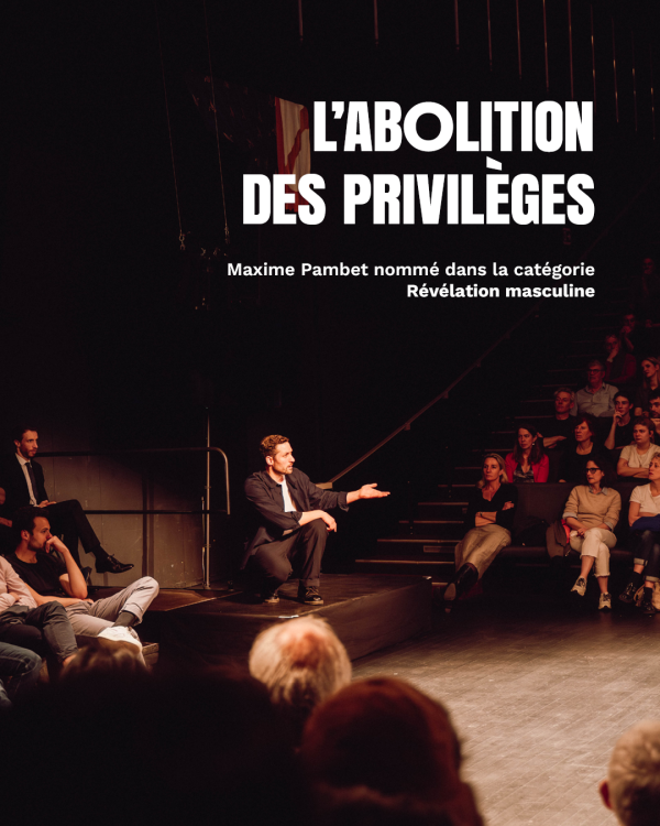 - L'ABOLITION DES PRIVILÈGES de Hugues Duchêne / Compagnie Le Royal Velours avec Maxime Pambet, nommé dans la catégorie Révélation masculine (accueilli aux Halles de Tonnay-Charente en octobre 2025)