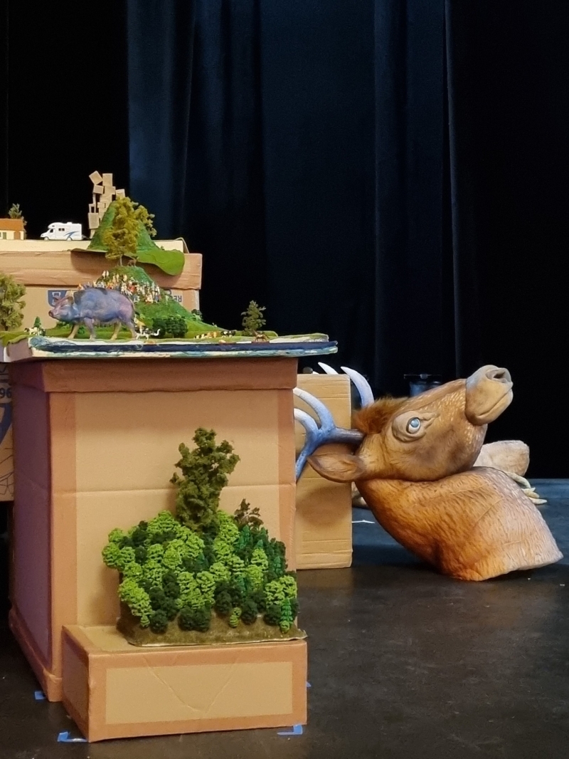 En février, la compagnie Elvis Alatac s'est installée à La Coupe d'Or pendant une semaine pour peaufiner sa prochaine création, Semeurs de panique. Au plateau, entourés de jolis décors évoquant la forêt, les comédiens ont donné vie aux marionnettes, sous l'œil attentif du metteur en scène, Pier Porcheron. Tout un monde imaginaire peuplé de grenouilles, cerfs et cochons a investi notre scène pendant ces quelques jours.